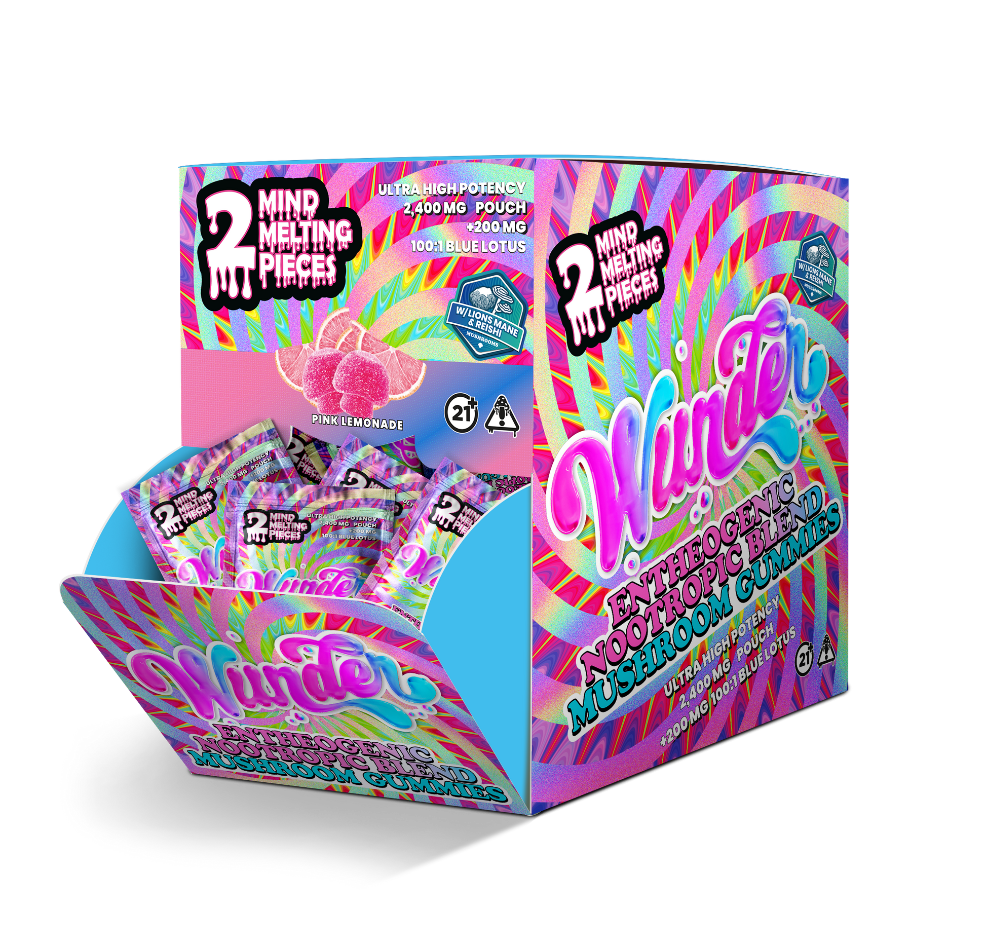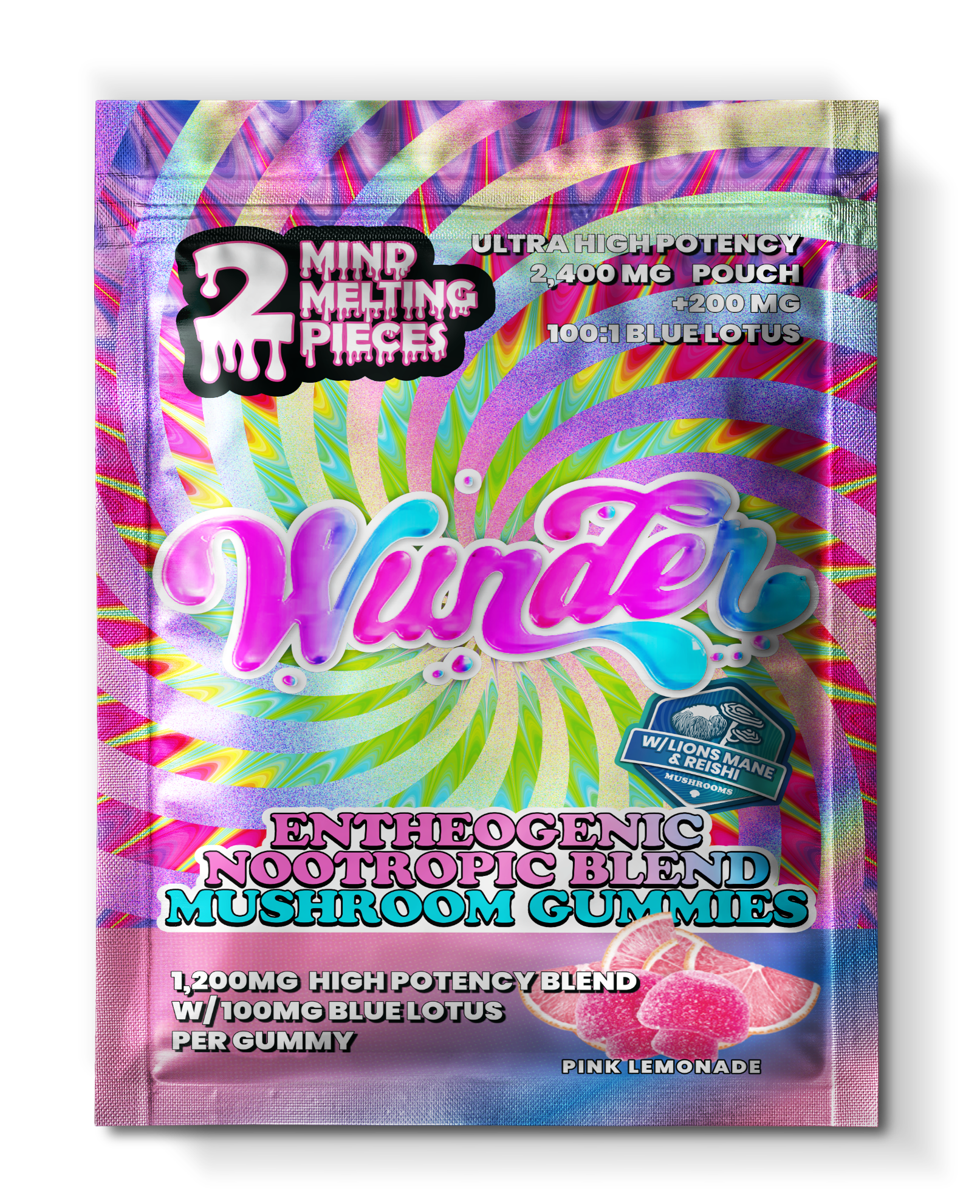 Potent. Compact. Refreshing. These Wunder High Mushroom Blend Gummies bring a bold 1,200 mg entheogenic blend per pouch in a convenient 2-piece format. Each gummy also includes 2 mg THCP, delivering enhanced effects with a tart, citrusy Pink Lemonade flavor.